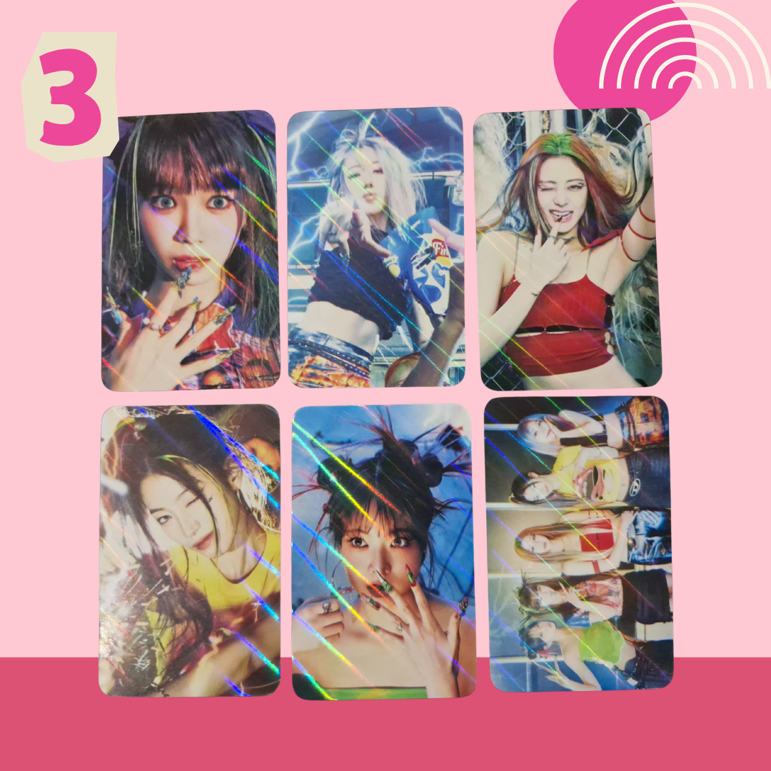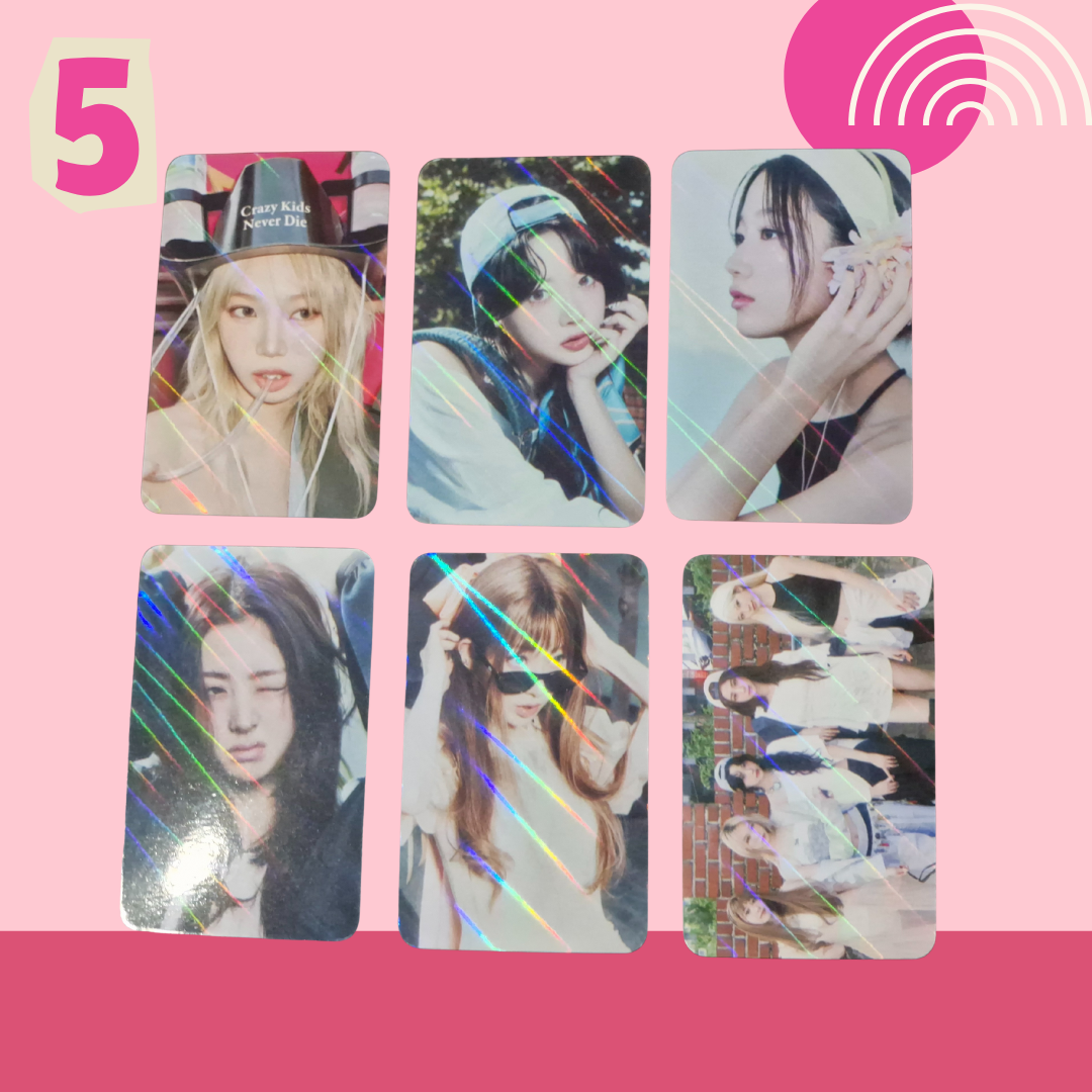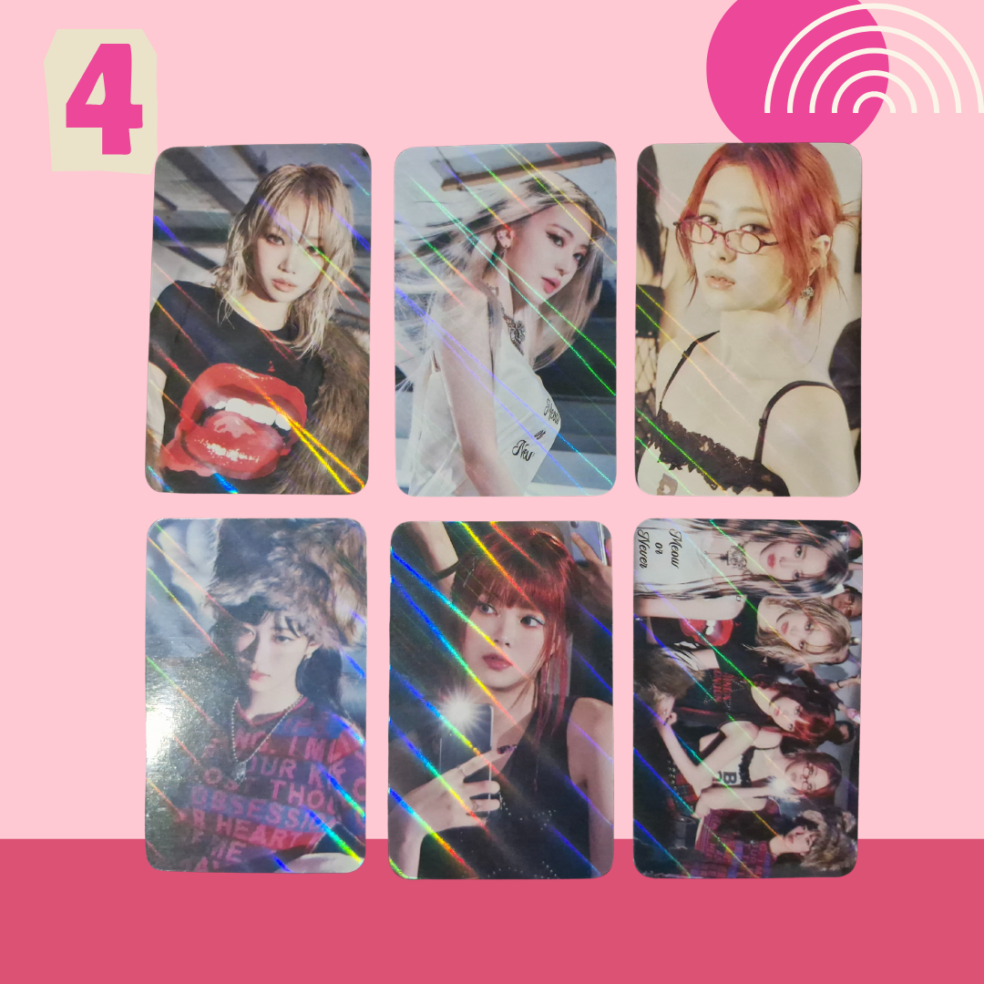 Includes 5-6 double-sided photocards (quantity dependent on pack). Standard size: 5.5cm × 8.5cm. Gloss finish, Holographic & Double-sided. Please note: These photocards are unofficial.