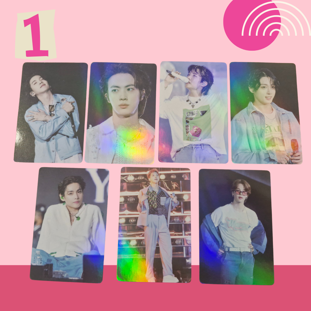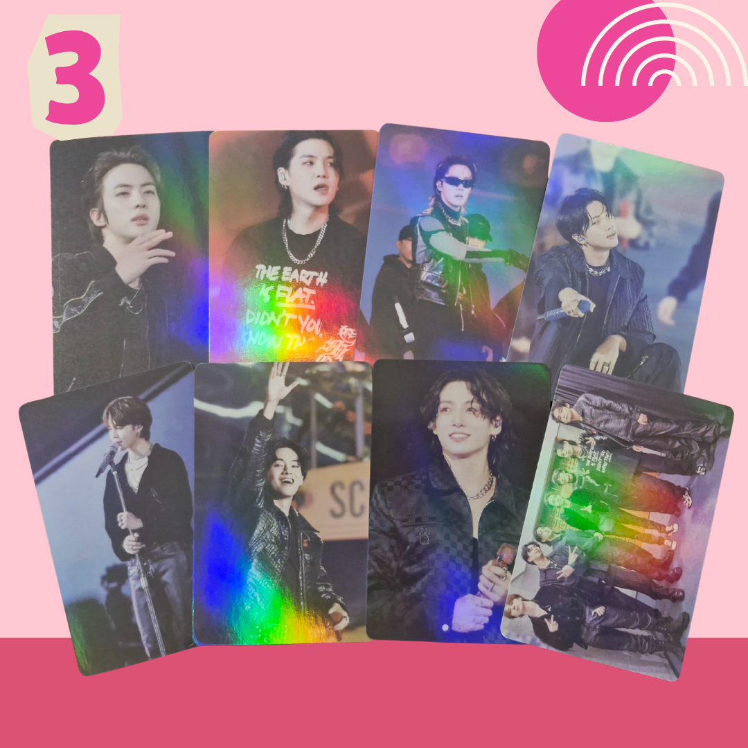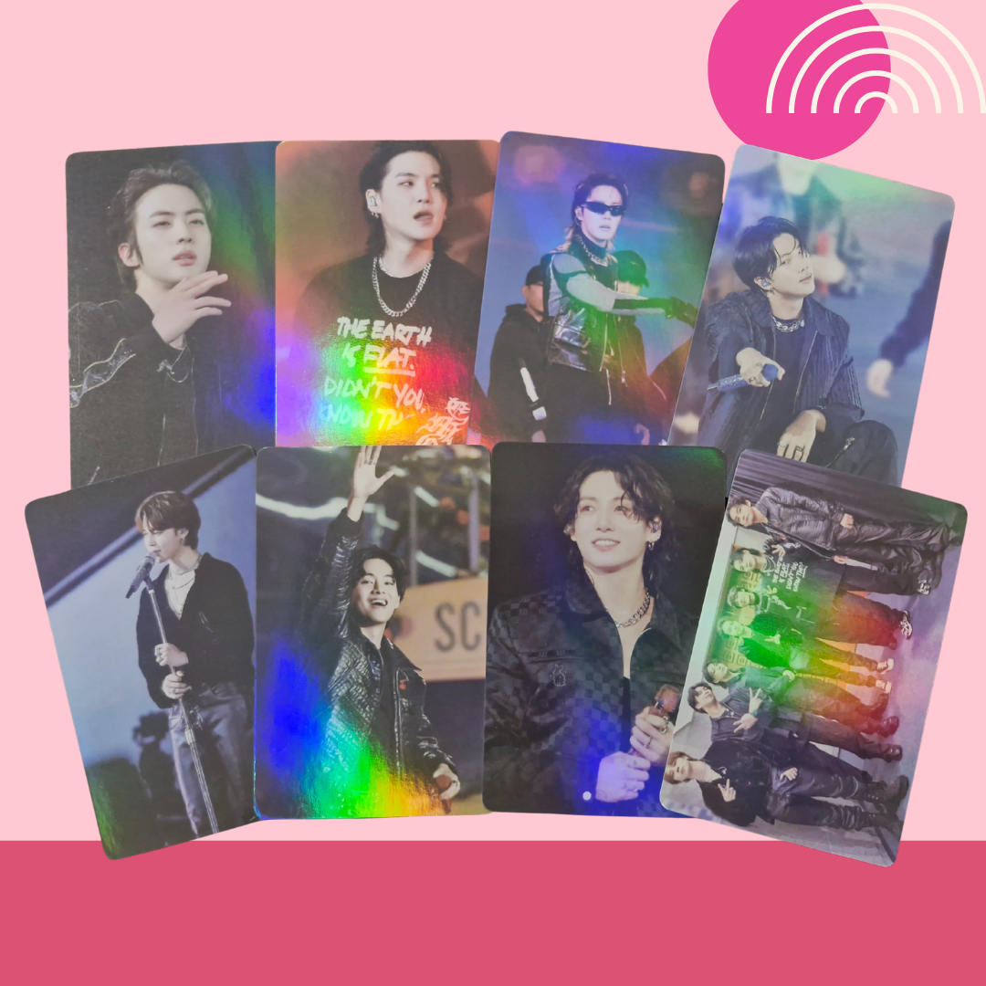 Includes 8-7 double-sided photocards (quantity dependent on pack). Standard size: 5.5cm × 8.5cm. Gloss finish, Holographic & Double-sided. Please note: These photocards are unofficial.