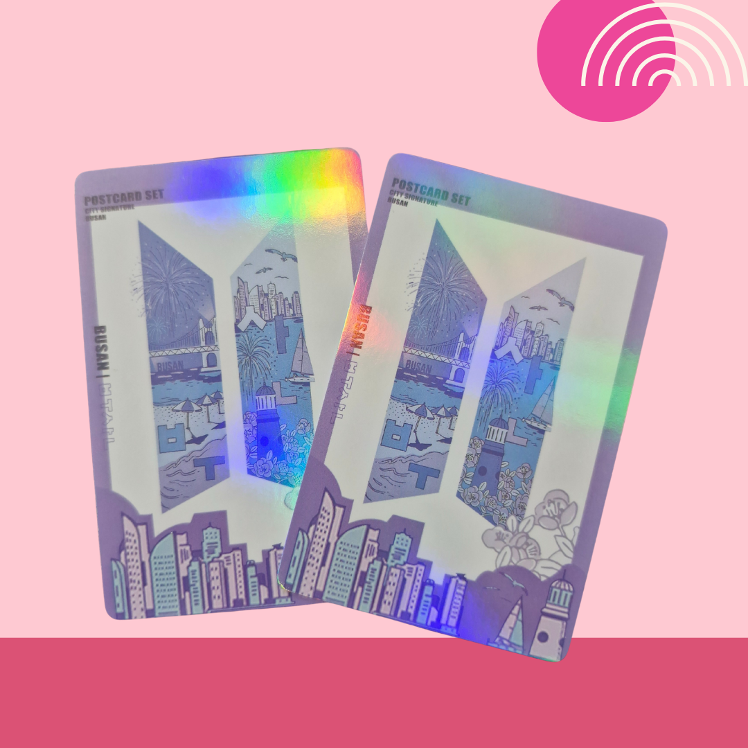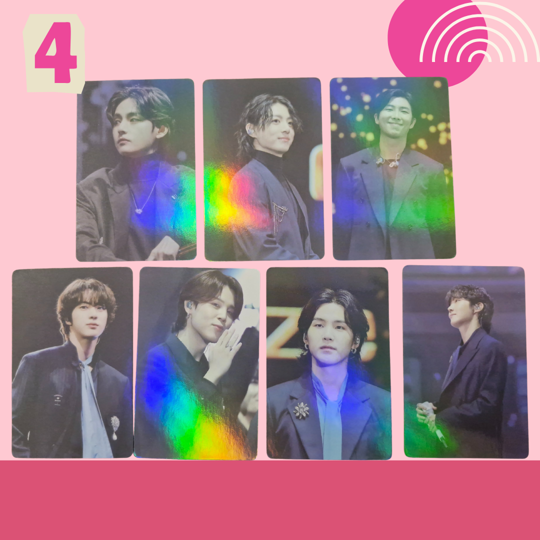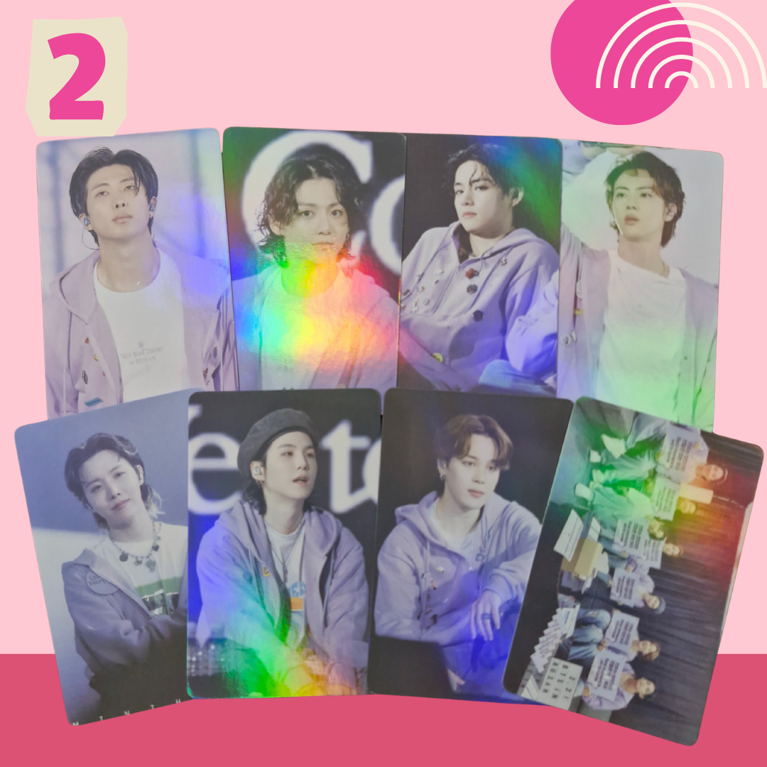 Includes 8-7 double-sided photocards (quantity dependent on pack). Standard size: 5.5cm × 8.5cm. Gloss finish, Holographic & Double-sided. Please note: These photocards are unofficial.
